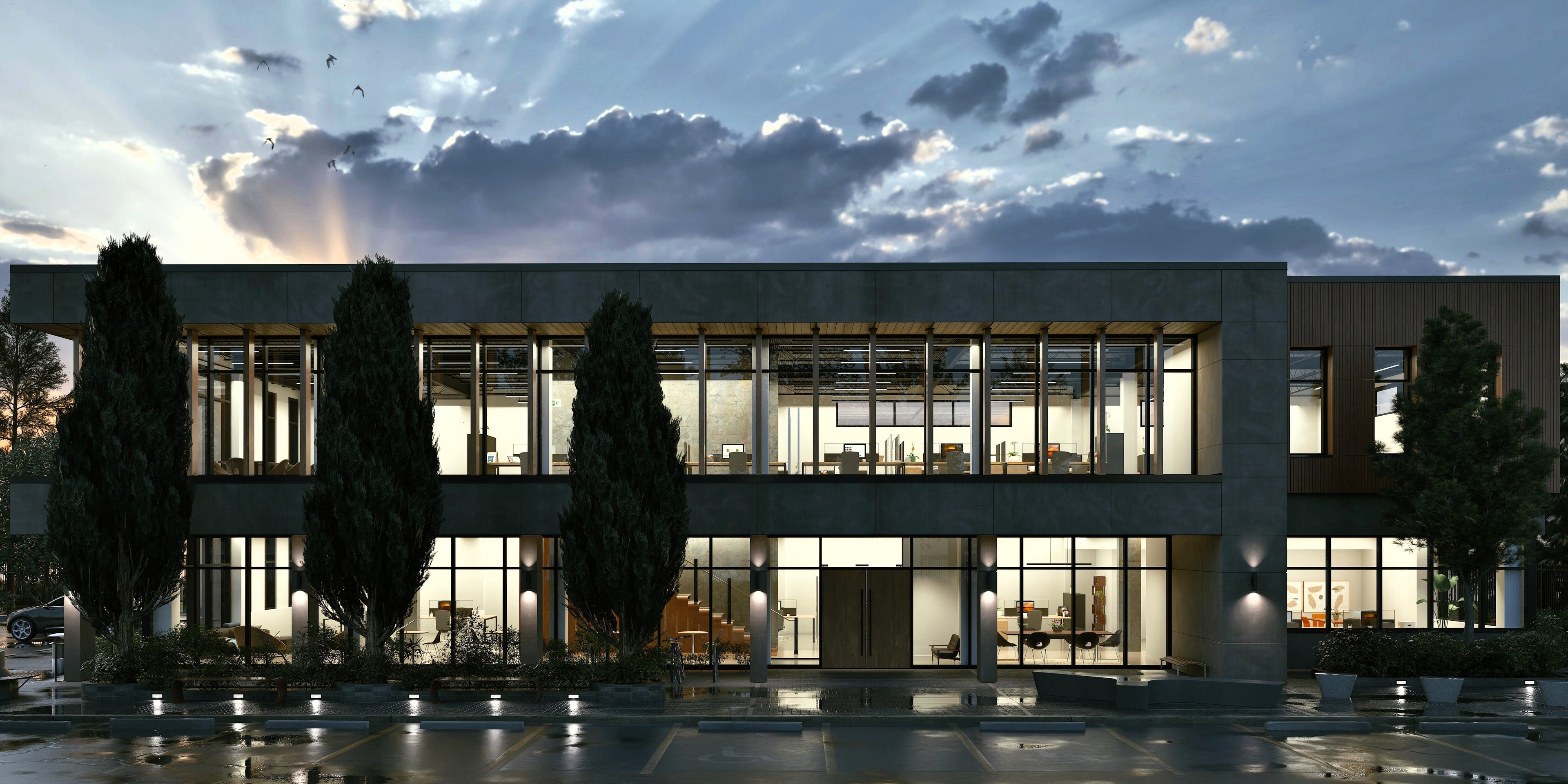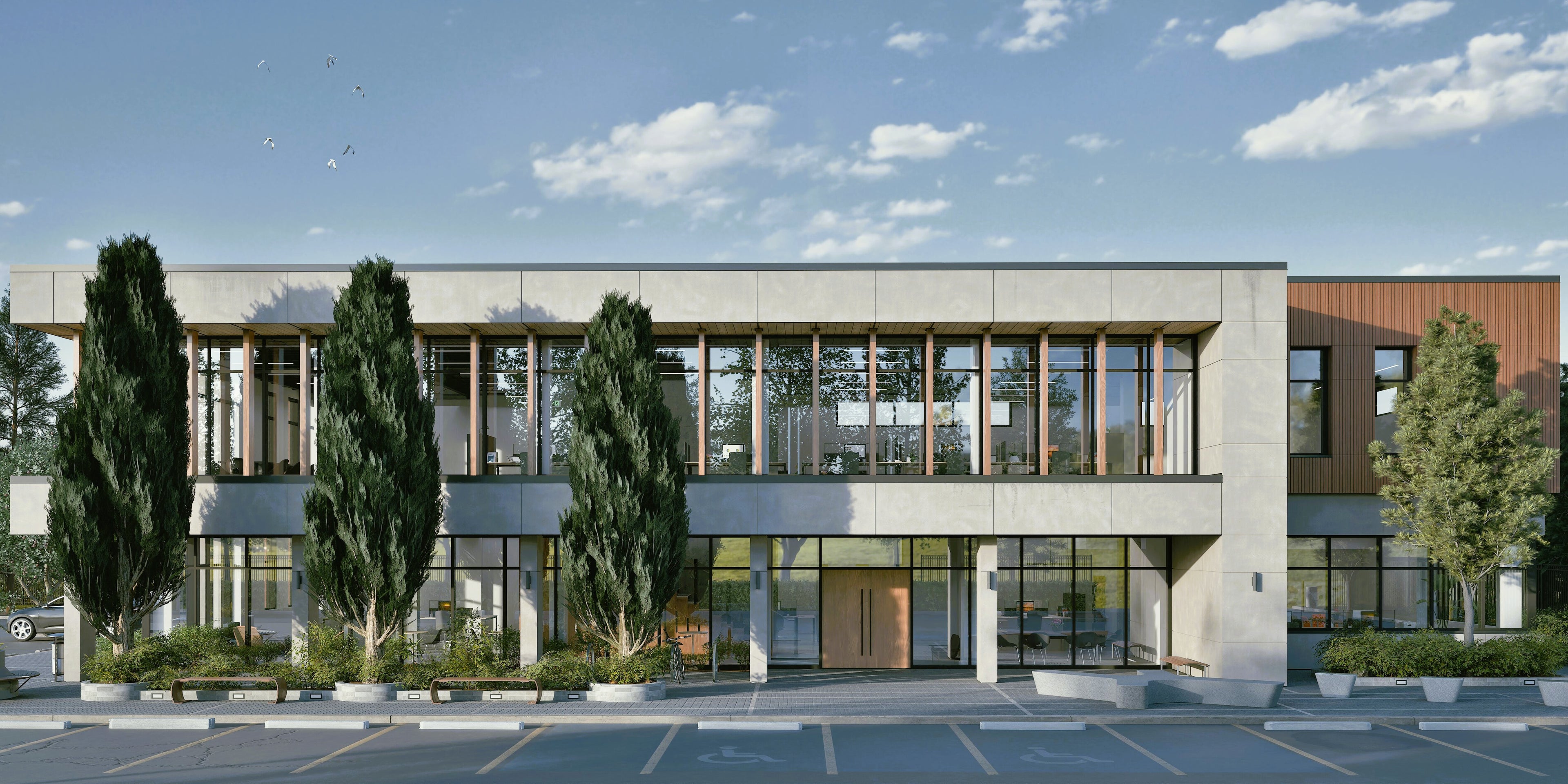 This two-story, 9,800 sq.ft (910 m²) office building has been designed to combine modern aesthetics with functional, adaptable workspaces. The architectural expression is defined by a mix of contemporary materials and clean, timeless lines, creating a professional yet inviting presence.