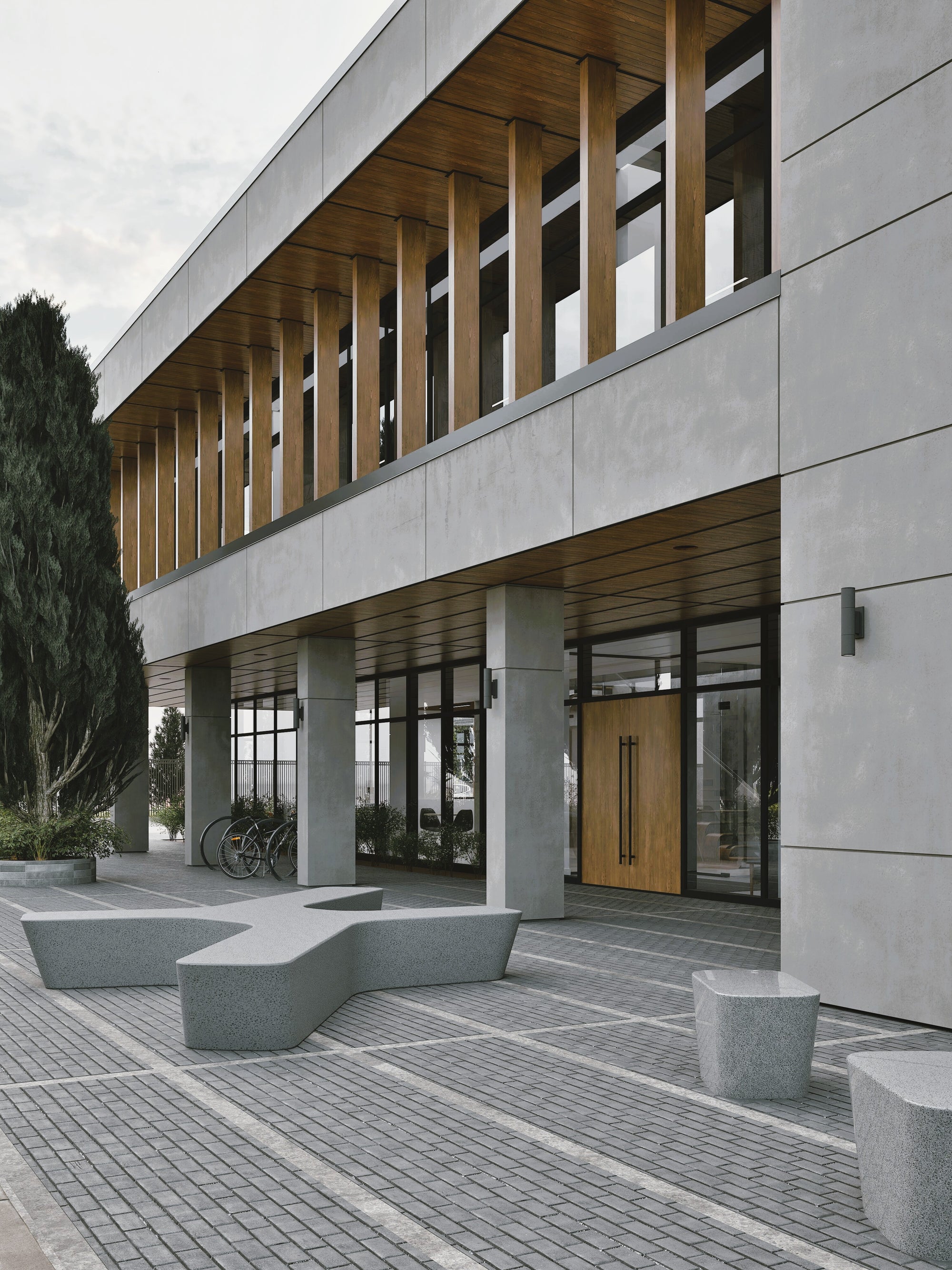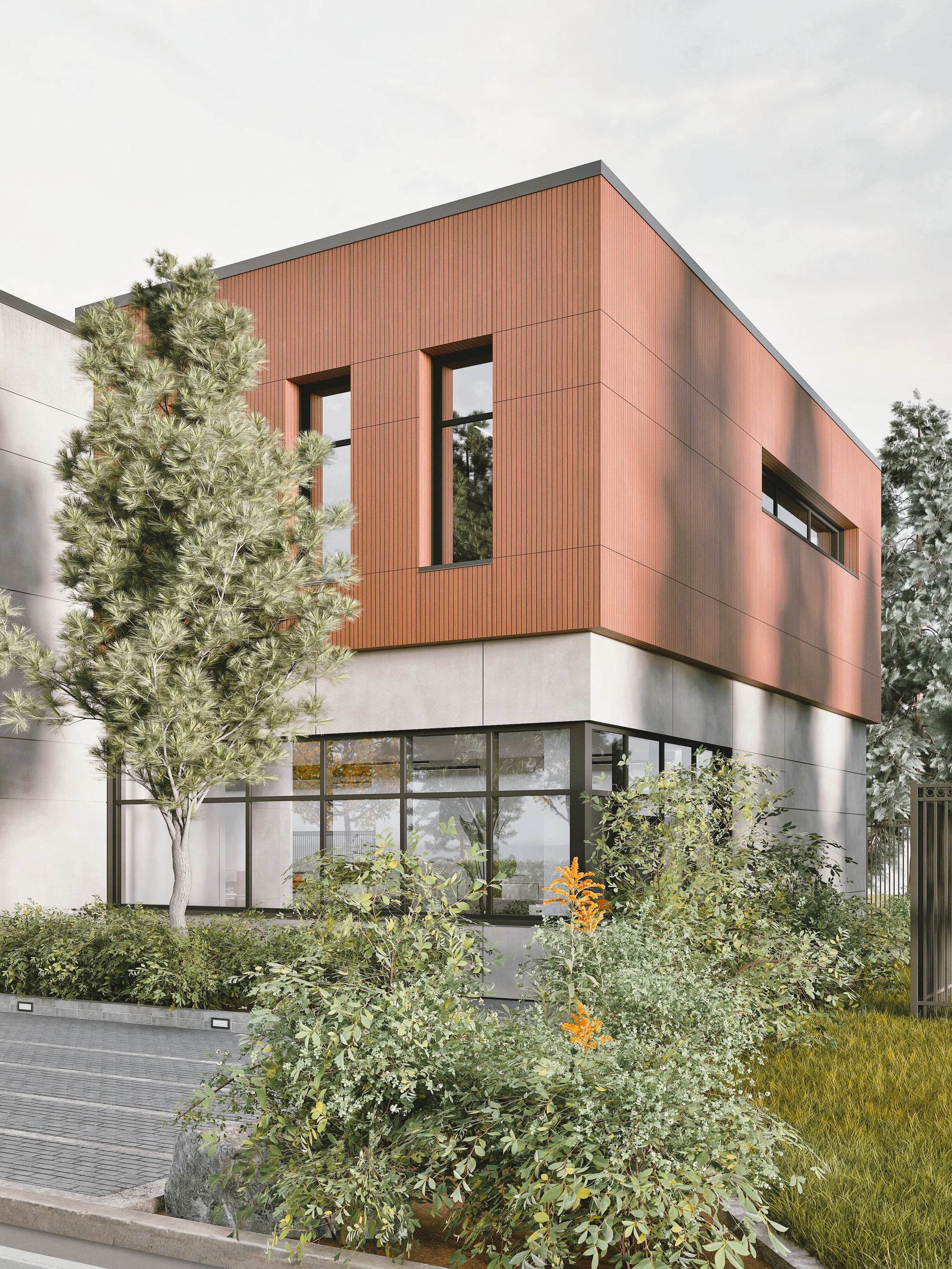 The exterior showcases fiber cement wall panels with a textured faux-concrete finish, paired with fluted Belgian composite siding in a warm “Mid-Day Rust” tone. Together, these materials create a striking façade that balances durability with sophistication. Aluminum curtain walls with triple-glazed panels provide expansive daylighting, ensuring bright, comfortable interior environments while supporting energy efficiency. Engineered wood soffit panels soften the exterior expression, adding warmth and natural contrast to the modern palette.