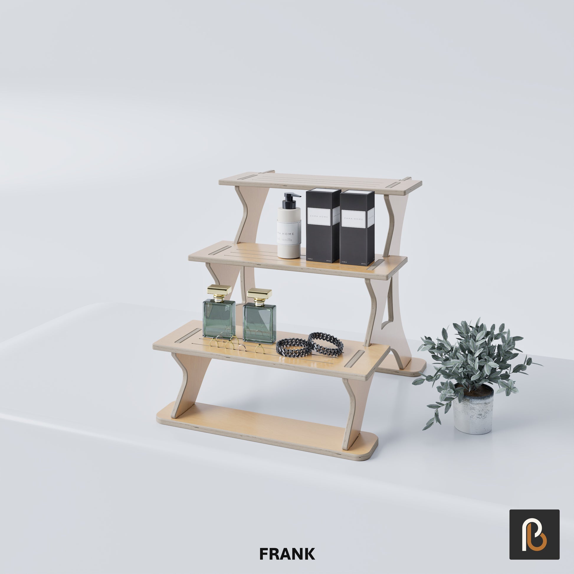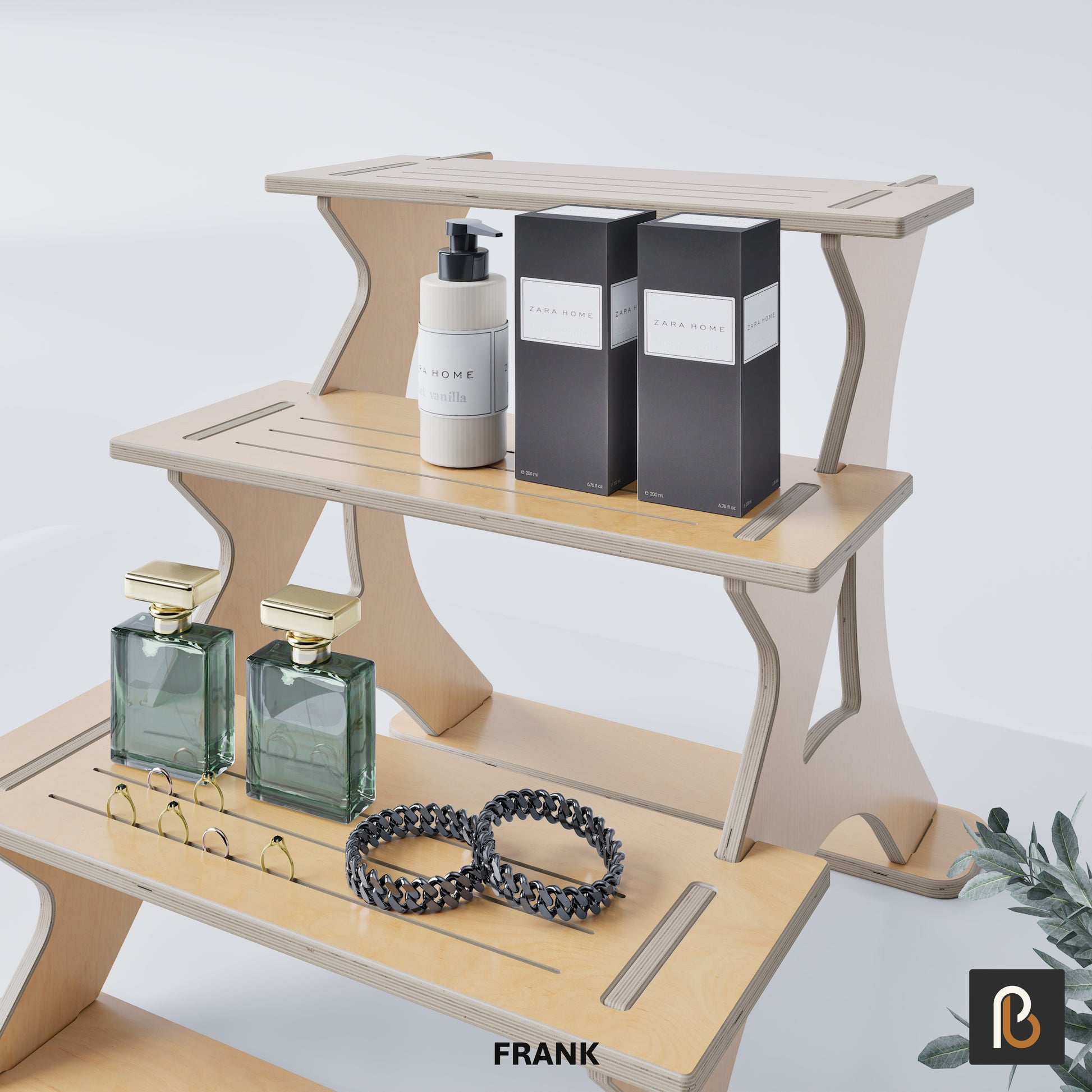 Frank is our smallest 3-tier tabletop display—compact, versatile, and easy to set up. Made from cabinet-grade plywood with a smooth surface coating, providing a durable, wipeable surface. This lightweight display consists of only five pieces and weighs just 6 lbs.