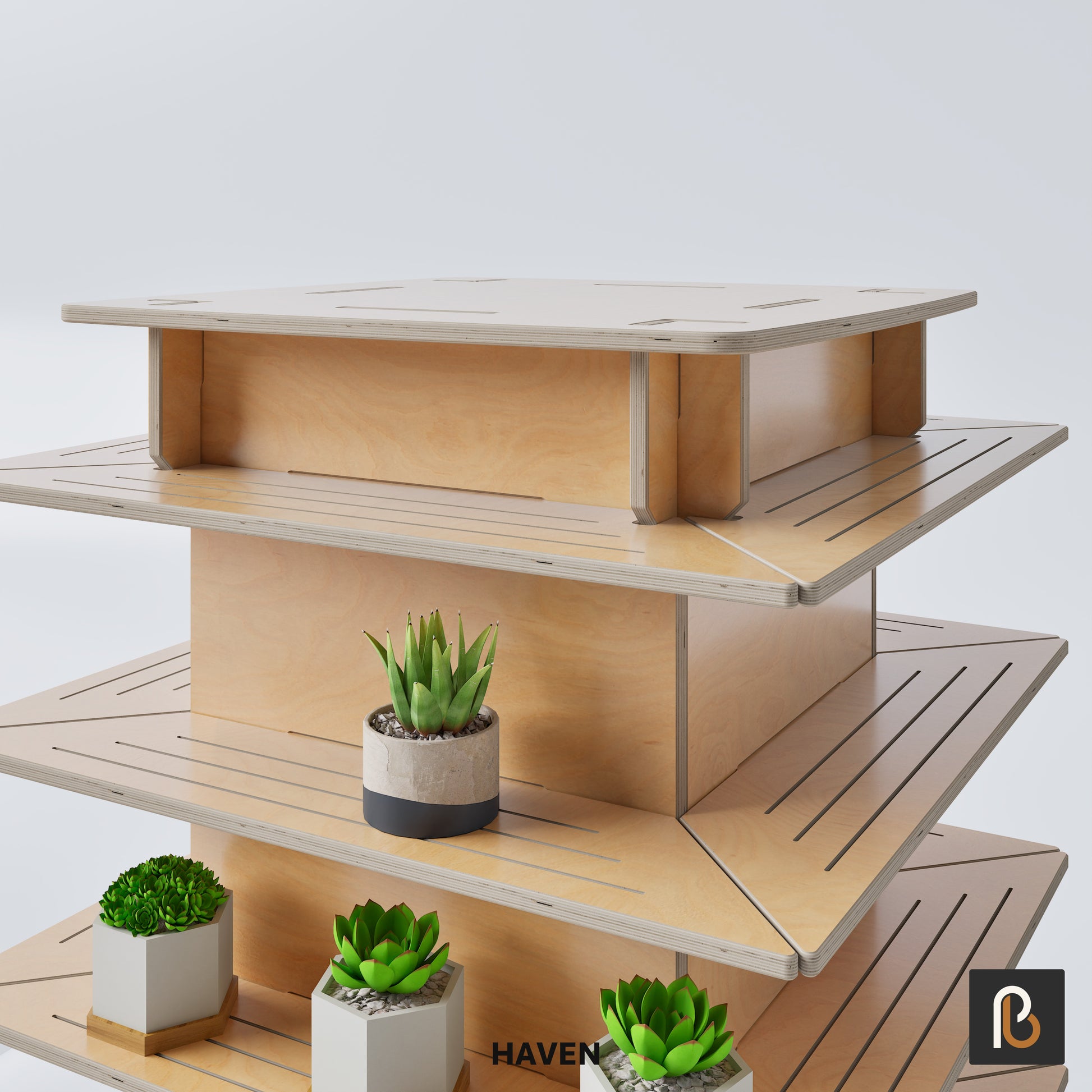 Display your products with Haven, our 4-sided 360° modular tabletop display. Made from cabinet-grade Birch plywood, all of the pieces interlock together, assembling the display in seconds. The wood comes with a smooth surface coating, providing a durable, wipeable surface.