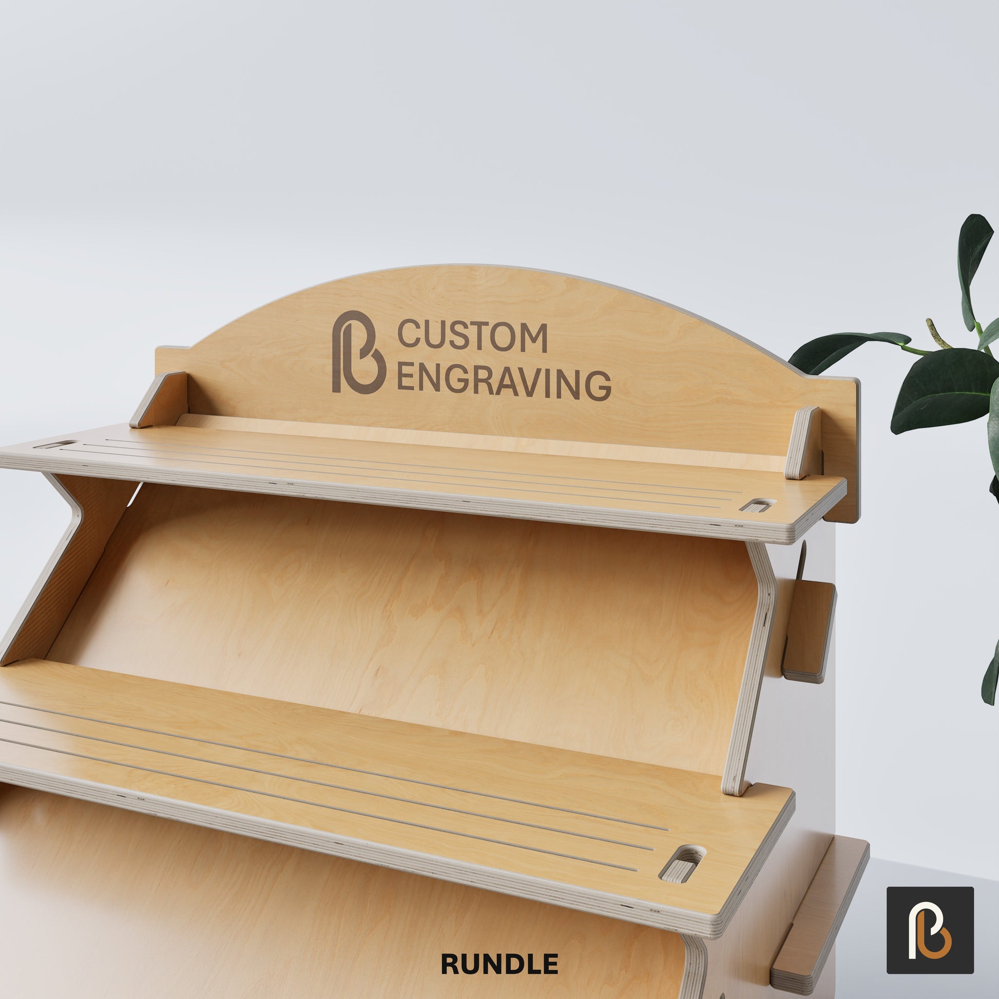 The Rundle is our original 3 tiered tabletop display. Made from cabinet-grade Birch plywood, all of the pieces interlock together, assembling the display in seconds. The wood comes with a smooth surface coating, providing a durable, wipeable surface.
